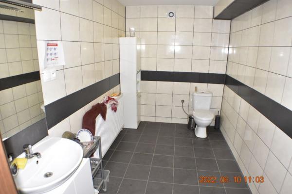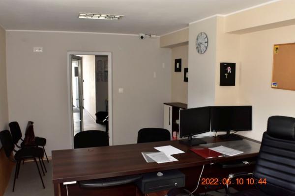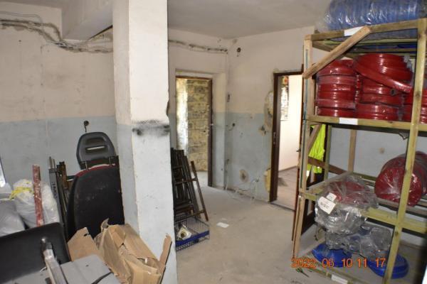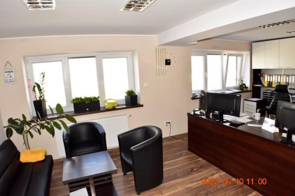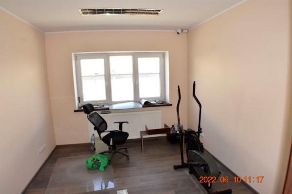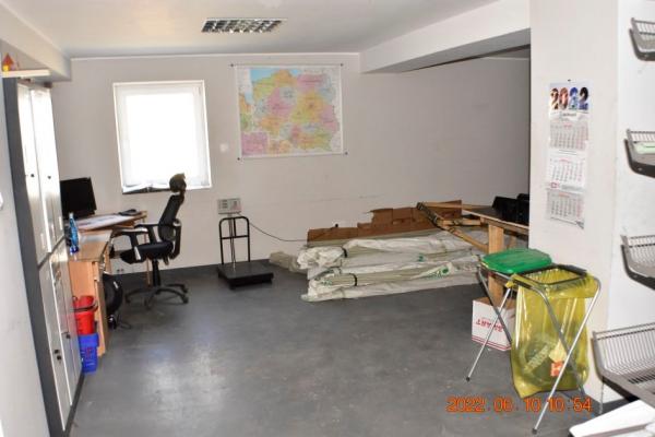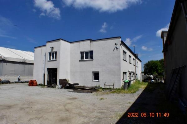 Budynek magazynowo-biurowy: obiekt wolnostojÄ…cy, niepodpiwniczony, dwukondygnacyjny i przykryty pÅ‚askim dachem. Pow. zabud. 288m2, pow. caÅ‚kowita 576m2, pow. użytk. 402,5m2,wys. pom. 2,36-2,47m. Budynek posiada cztery wejÅ›cia: dwa na parter oraz dwa na piÄ™tro. Struktura budynku : parter: wejÅ›cie 18,1m2, magazyn 111,7m2, pom. socj. 7,7m2, wc 6,7m2, biuro I 22,3m2, kotÅ‚ownia 10,9m2, biuro II 17,2m2 - razem 194,6m2; piÄ™tro: biuro III 11,1m2, magazyn II 65,4m2, pom. biurowe I 7,8m2, pom.biurowe II 20,7m2, Å‚azienka 8,3m2, warsztat 10,7m2, pom. biurowe III 23,8m2, sala + kuchnia + korytarz 78,1m2 - razem 225,9m2 Budynek wybudowany okoÅ‚o 50 lat temu w technologii tradycyjnej, Å›ciany murowane z cegÅ‚y i pustaków żużlobetonowych, stropy żelbetowe monolityczne, dach pÅ‚aski dwuspadowy pokryty papÄ… na lepiku, stolarka - PCV z szybÄ… zespolonÄ…; drzwi drewniane. Budynek wyposażony w instalacjÄ™ wodociÄ…gowÄ…, kanalizacyjnÄ…, elektrycznÄ…, wentylacji grawitacyjnej; ogrzewanie - indywidualne: centralne zasilanie z kotÅ‚a na opaÅ‚ staÅ‚y.