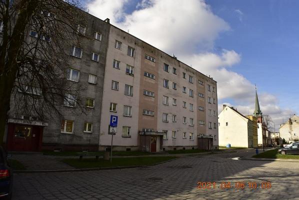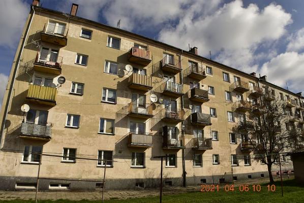 Lokal w budynku wielorodzinny (r.bud. 1971r) podpiwniczonym, pięciokondygnacyjnym wybudowany w technologii tradycyjnej. Lokal mieszkalny jest lokalem środkowym, położonym na III piętrze, okna z lokalu wychodzą na dwie strony (północ i południe). Wejście do lokalu z klatki schodowej. Struktura pow.: przedpokój 6,0m2; pokój I 15,5m2; łazienka z WC 3,1m2; kuchnia 6,6m2; pokój II 11,8m2 -razem 43,0m2 Układ lokalu rozkładowy , z jasną kuchnią ( gazowa kuchenka z piekarnikiem -gaz z butli, w kuchni znajduje się kocioł CO na opał stały), łazienka z WC ciemna ( w łazience pojemnościowy podgrzewacz wody). Lokal posiada balkon od strony podwórka (południa), do lokalu przynależy piwnica na zasadach udziału w częściach wspólnych.