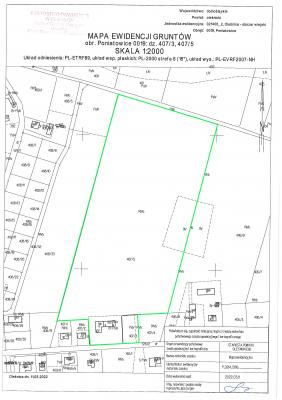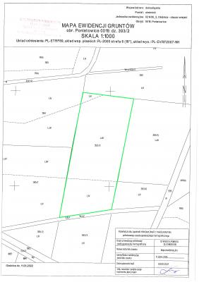 Nieruchomość położona w połud.części Koloni Poniatowice. Działka 393/2 o pow.0,65ha, wym.: szer.55m x głęb.135m, teren płaski, nie posiada bezpośredniego dostępu do drogi publicznej. Nieogrodzona, niezabudowana, nieutwardzona, porośnięta zielenią. Łąki klasy III-0,16ha, lasy klasy IV-0,49ha, kompleks: użytki zielone średnie oraz lasy, gleby bielicowe i pseudobielicowe. Północna część porośnięta lasem. Siedliskowy typ: las mieszany świeży. Działka 407/3 o pow.0,10ha, wym.: szer.24m x głęb.42m, teren płaski. Działka posiada pośredni bezpośredni dostęp do utwardzonej drogi publicznej oraz dostęp do sieci wodociągowej, elektroenergetycznej i telefonicznej w drodze, teren ogrodzony siatką handlowej rozpiętej na metalowych słupkach , niezabudowana, nieutwardzona. . Wykorzystywana była jako plac dla maszyn rolniczych oraz droga dojazdowa na tył działki 407/5. Działka 407/5 o pow. 5,16ha, kształt zbliżony do „litry T”, teren płaski. Posiada bezpośredni dostęp do utwardzonej drogi publicznej i sieci wodociągowej, elektroenergetycznej i telefonicznej w drodze. Na działce znajduje się studnia oraz bezodpływowy zbiornik na ścieki tzw. szambo. Połud. część działki w kształcie prostokąta o wym.:szer.50m x głęb.42m, teren ogrodzony, zabudowana, nieutwardzona. Większa pół. część działki wym.:szer.160m x głęb.ość 350m, nieogrodzona, niezabudowana, wykorzystywana rolniczo. Grunty orne klasy IVb-4,6633ha, grunty orne klasy V-0,2700ha. Kompleks żytni dobry, gleby brunatne właściwe. W budynku znajdują się: część mieszkalna, chlewnia, stodoła i garaż, pow. zabud. 310m2, w tym pow.zabud. części mieszkalnej 169m2. Budynek mieszkalny jednorodzinny w zabudowie zwartej, niepodpiwniczony, parterowy z poddaszem nieużytkowym (z możliwością adaptacji), w budynku pomieszczenia mieszkalne z kotłownią. Instalacje: wodno-kanalizacyjna (woda ze studni), elektryczna, ogrzewanie z kotła na opał stały z grzejnikami panelowymi. Ciepła woda podgrzewana zbiorniku od c.o. Budynek gospodarczy w zabudowie zwartej, bez podpiwniczenia, parterowy z poddaszem użytkowym (magazyn suszu). Budynek przylega do budynku mieszkalnego. Pow. użytkowa 67,8 m2. Wyposażony w instalację wodno-kanalizacyjną i elektryczną. Brak ogrzewania. Budynek gospodarczy w zabudowie zwartej, z częściowo zagłębiona piwnicą, parterowy, przylega do budynku chlewni, pow. użytk. 101,9m2. Budynek wykorzystywany jako magazyn zboża i suszu oraz skład narzędzi i urządzeń. Brak tynków, instalacja elektryczna. Przeznaczenie w MPZP Pół. część działki 393/2 : ZL/21 - tereny lasów i zadrzewień , połud. część działki 393/2 : R/28 - tereny rolnicze, pół. część działki 407/5: R/29 - tereny rolnicze, połud. część działki 407/5 i działka 407/3: MN/29 - tereny zabudowy mieszkaniowej jednorodzinnej. Dodatkowo południowa część działki 407/5 oraz działka 407/3 leżą w strefie "OW" ochrony archeologicznej.