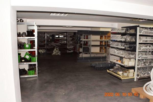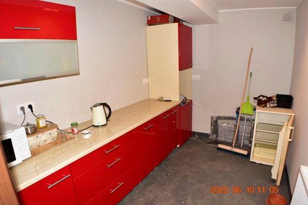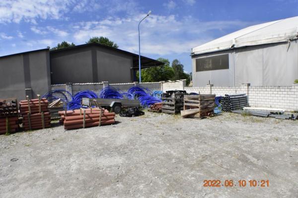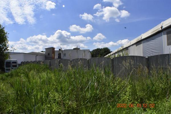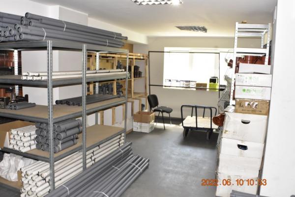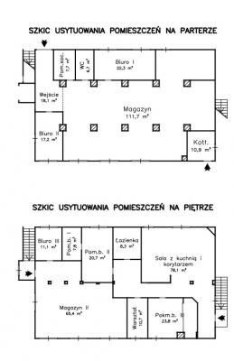 Budynek magazynowo-biurowy: obiekt wolnostojÄ…cy, niepodpiwniczony, dwukondygnacyjny i przykryty pÅ‚askim dachem. Pow. zabud. 288m2, pow. caÅ‚kowita 576m2, pow. użytk. 402,5m2,wys. pom. 2,36-2,47m. Budynek posiada cztery wejÅ›cia: dwa na parter oraz dwa na piÄ™tro. Struktura budynku : parter: wejÅ›cie 18,1m2, magazyn 111,7m2, pom. socj. 7,7m2, wc 6,7m2, biuro I 22,3m2, kotÅ‚ownia 10,9m2, biuro II 17,2m2 - razem 194,6m2; piÄ™tro: biuro III 11,1m2, magazyn II 65,4m2, pom. biurowe I 7,8m2, pom.biurowe II 20,7m2, Å‚azienka 8,3m2, warsztat 10,7m2, pom. biurowe III 23,8m2, sala + kuchnia + korytarz 78,1m2 - razem 225,9m2 Budynek wybudowany okoÅ‚o 50 lat temu w technologii tradycyjnej, Å›ciany murowane z cegÅ‚y i pustaków żużlobetonowych, stropy żelbetowe monolityczne, dach pÅ‚aski dwuspadowy pokryty papÄ… na lepiku, stolarka - PCV z szybÄ… zespolonÄ…; drzwi drewniane. Budynek wyposażony w instalacjÄ™ wodociÄ…gowÄ…, kanalizacyjnÄ…, elektrycznÄ…, wentylacji grawitacyjnej; ogrzewanie - indywidualne: centralne zasilanie z kotÅ‚a na opaÅ‚ staÅ‚y.